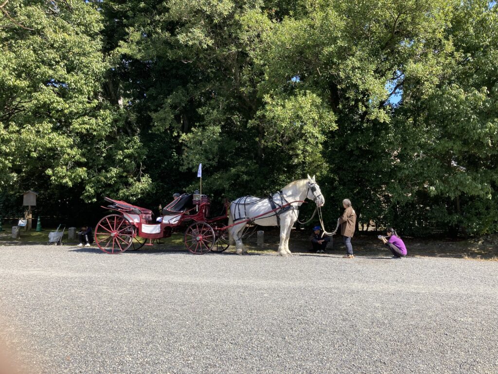 衣装を着たまま談笑している参加者や、静かに待機する馬や馬車の姿が点在しています。