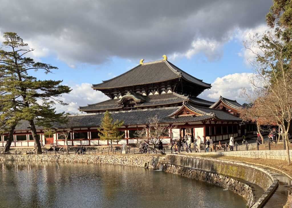 奈良公園を歩きながら、東大寺大仏殿を眺めます。