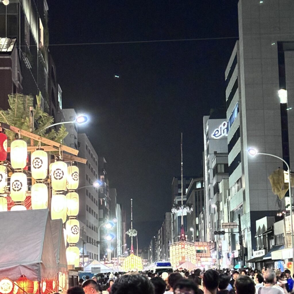 日が落ち、街に「コンチキチン」の囃子が響き渡ると、宵山はいよいよ本番を迎えます。昼とは打って変わった、闇に浮かぶオレンジ色の駒形提灯。この灯りの変化こそが、京都の夏が放つ最大の魔力かもしれません。