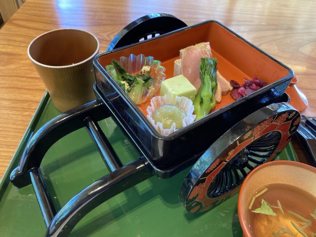 御所車に揺られる、雅な宮廷ランチ。運ばれてきた瞬間に目を奪われる、「御所車御膳」。御所車の形をした二段重ねの器には、京都らしい滋味がぎゅっと詰まっています。